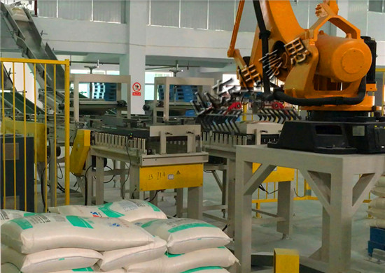 鉀肥自動碼垛機主要由機械主體、伺服驅動系統、手臂機構、末端執行器(抓手)、末端執行器調節機構以及檢測機構組成,按不同的物料包裝、堆垛順序、層數等要求進行參數設置,實現不同類型包裝物料的碼垛作業。按功能劃分為進袋、轉向、排袋、編組、抓袋碼垛、托盤庫、托盤輸送以及相應的控制系統等機構。