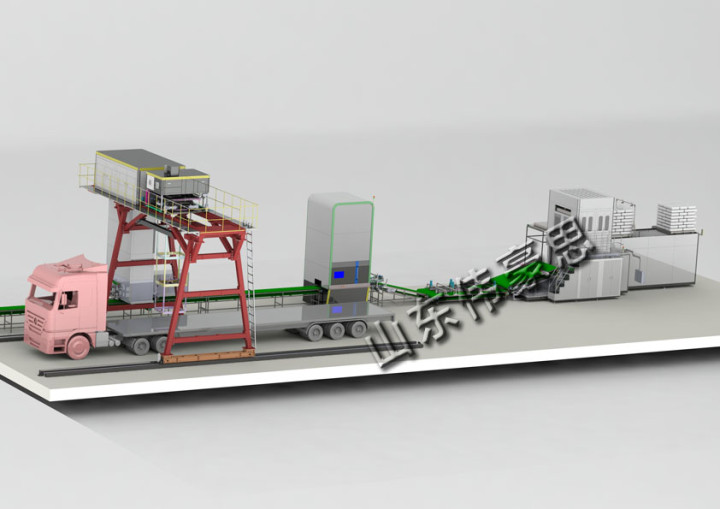 車(che)(che)(che)輛沿線(xian)(xian)往前(qian)駛入裝車(che)(che)(che)區(qu)(qu);車(che)(che)(che)輛停車(che)(che)(che)后,在(zai)控(kong)制(zhi)柜處選擇(ze)相應車(che)(che)(che)型和裝貨量,系統(tong)會(hui)自(zi)動生(sheng)成(cheng)裝車(che)(che)(che)程序;由存儲倉庫里自(zi)動拆(chai)垛或生(sheng)產車(che)(che)(che)間生(sheng)產的袋裝物(wu)料,經過(guo)皮帶輸(shu)(shu)送線(xian)(xian)傳送到(dao)裝車(che)(che)(che)機(ji)(ji)(ji)區(qu)(qu)域(yu),物(wu)料輸(shu)(shu)送到(dao)裝車(che)(che)(che)區(qu)(qu)域(yu),經過(guo)連續提升(sheng)機(ji)(ji)(ji)爬升(sheng)、輸(shu)(shu)送到(dao)高層(ceng)輸(shu)(shu)送線(xian)(xian)上(shang)(shang)(shang),然后整理、換向進入碼(ma)垛區(qu)(qu)的滾筒(tong)輸(shu)(shu)送線(xian)(xian)。物(wu)料到(dao)達機(ji)(ji)(ji)器(qi)人的抓取位后,通過(guo)擋(dang)板定位緩(huan)存在(zai)線(xian)(xian)體上(shang)(shang)(shang),輸(shu)(shu)送線(xian)(xian)上(shang)(shang)(shang)緩(huan)存兩袋后,機(ji)(ji)(ji)器(qi)人開(kai)始抓取并裝車(che)(che)(che),滾筒(tong)輸(shu)(shu)送線(xian)(xian)采用(yong)積放式滾筒(tong),可以在(zai)物(wu)料緩(huan)存時物(wu)料下方的滾筒(tong)停止(zhi)轉(zhuan)動,取走后恢復轉(zhuan)動。
