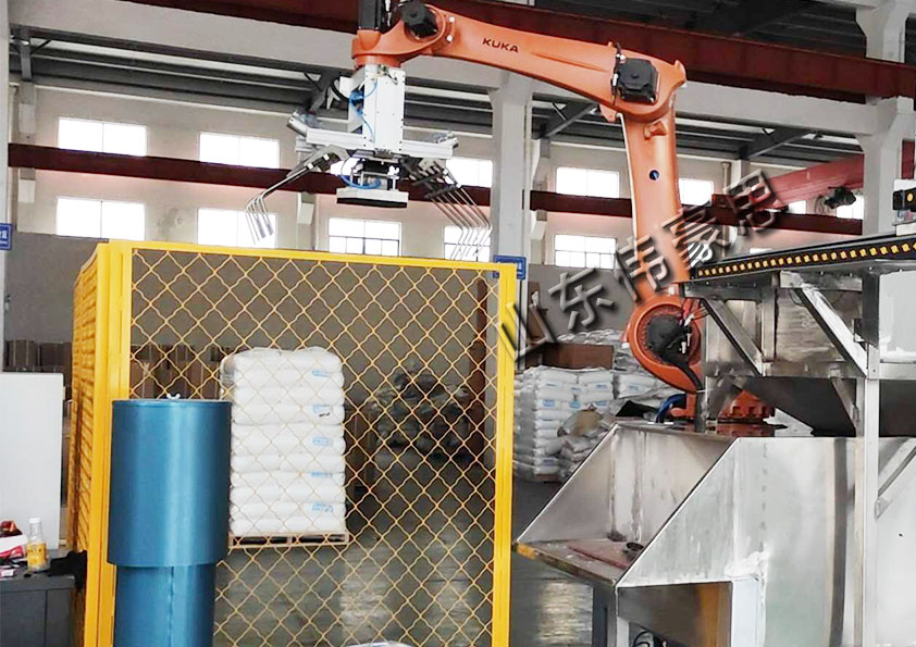 重鈣粉全自動拆垛機主要由機械主體、伺服驅動系統、手臂機構、末端執行器(抓手)、末端執行器調節機構以及檢測機構組成,按不同的物料包裝、堆垛順序、層數等要求進行參數設置,實現不同類型包裝物料的拆垛作業。