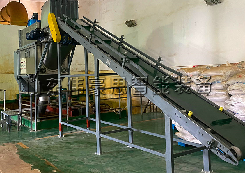 硫氫化鈉自動拆包機因物料性質、使用場合、出料方式等變化,其整套設備的配置、產量、材質、功率等有所變化,配套設備:拆垛機器人、管鏈輸送機、螺旋輸送機、提升機、氣力輸送等。