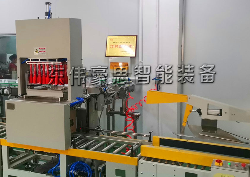為了提高更高的效率,在果醋箱機械手碼垛機前端可以配置上我公司生產的全自動開箱機,全自動裝箱機,全自動封箱機組成全自動裝箱碼垛設備,它具有很高的靈活性和適應性,而運轉速度也很高,簡化的工作方式,方便更換變更件,以適應不同瓶體的產品,該設備只需單人操作,整體結構對工廠的空間要求低,非常方便的適應于各種產品的裝箱碼垛。