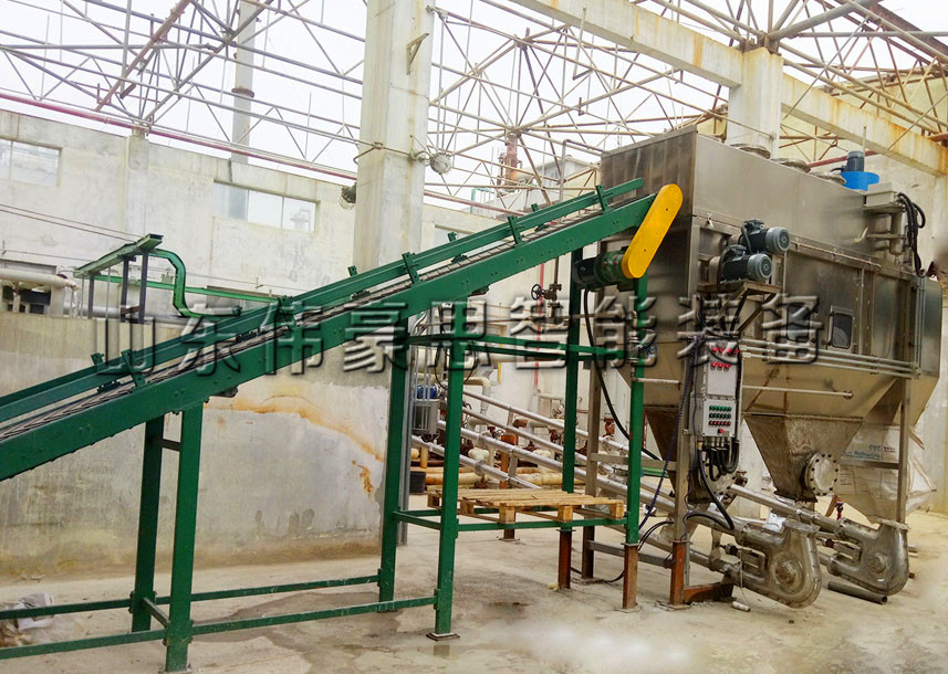由人工或自(zi)動(dong)送料裝置將(jiang)料袋(dai)(dai)進行上袋(dai)(dai),通(tong)過(guo)上袋(dai)(dai)輸送機自(zi)動(dong)將(jiang)袋(dai)(dai)裝物(wu)料傳送至45度角的滑(hua)板(ban)(ban)上,并(bing)依靠料(liao)(liao)料(liao)(liao)袋(dai)(dai)(dai)(dai)(dai)其重力沿滑(hua)板(ban)(ban)下(xia)(xia)滑(hua),在下(xia)(xia)滑(hua)過(guo)程中(zhong)由(you)(you)快速旋轉的刀(dao)片將包(bao)裝(zhuang)袋(dai)(dai)(dai)(dai)(dai)割(ge)開,被(bei)割(ge)開的殘(can)袋(dai)(dai)(dai)(dai)(dai)和物料(liao)(liao)滑(hua)入物袋(dai)(dai)(dai)(dai)(dai)分(fen)(fen)離(li)(li)器(qi)進行(xing)篩(shai)分(fen)(fen)。從物袋(dai)(dai)(dai)(dai)(dai)分(fen)(fen)離(li)(li)器(qi)分(fen)(fen)離(li)(li)出(chu)來(lai)的物料(liao)(liao)由(you)(you)物料(liao)(liao)收集器(qi)收集并(bing)通過(guo)螺旋輸(shu)送(song)(song)機等輸(shu)出(chu)到(dao)儲存器(qi)內(也可用管(guan)鏈輸(shu)送(song)(song)裝(zhuang)置(zhi)或氣力輸(shu)送(song)(song)裝(zhuang)置(zhi),輸(shu)送(song)(song)至(zhi)物料(liao)(liao)儲罐中(zhong))。物袋(dai)(dai)(dai)(dai)(dai)分(fen)(fen)離(li)(li)器(qi)分(fen)(fen)離(li)(li)出(chu)的破(po)損包(bao)裝(zhuang)袋(dai)(dai)(dai)(dai)(dai)、雜質、結塊物料(liao)(liao)被(bei)輸(shu)送(song)(song)出(chu)去。割(ge)刀(dao)拆袋(dai)(dai)(dai)(dai)(dai)過(guo)程中(zhong)引起(qi)的粉塵(chen)(chen)由(you)(you)布袋(dai)(dai)(dai)(dai)(dai)式除塵(chen)(chen)器(qi)捕(bu)捉并(bing)抖落入物料(liao)(liao)收集。作業中(zhong)產生(sheng)的粉塵(chen)(chen)被(bei)設備自(zi)帶(dai)的除塵(chen)(chen)裝(zhuang)置(zhi)過(guo)濾凈(jing)化,不至(zhi)于污(wu)染(ran)環(huan)境,又能(neng)使工廠操作工人能(neng)在清潔的環(huan)境中(zhong)連續(xu)工作。