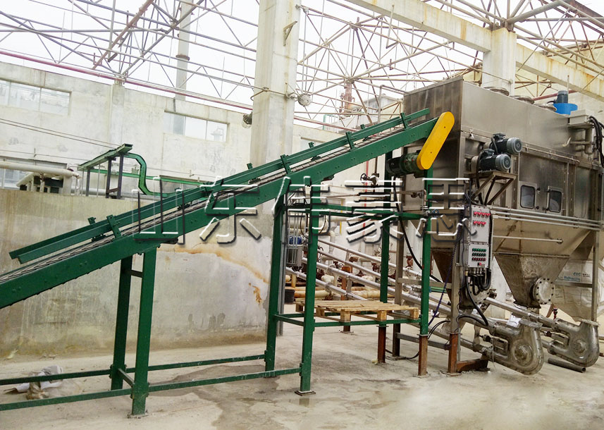 通過皮帶機自(zi)(zi)動(dong)給袋,在自(zi)(zi)動(dong)拆(chai)包(bao)站箱體內割刀自(zi)(zi)動(dong)拆(chai)包(bao)站,篩分機構自(zi)(zi)動(dong)袋料分離、卸料等步驟完(wan)(wan)成化(hua)(hua)工(gong)粉(fen)(fen)料的(de)(de)自(zi)(zi)動(dong)拆(chai)包(bao)站卸料工(gong)作,通過管鏈式輸(shu)送機將化(hua)(hua)工(gong)粉(fen)(fen)料輸(shu)送到指定位置。整個過程(cheng)僅需一(yi)人將化(hua)(hua)工(gong)粉(fen)(fen)料袋放置在皮帶機上(shang),后序過程(cheng)自(zi)(zi)動(dong)完(wan)(wan)成,大大節約(yue)了(le)勞動(dong)力,提高了(le)化(hua)(hua)工(gong)粉(fen)(fen)料自(zi)(zi)動(dong)拆(chai)包(bao)站卸料的(de)(de)生(sheng)產(chan)效(xiao)率。