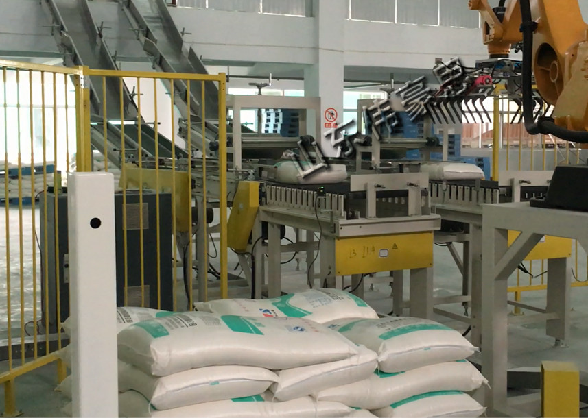5、一垛(duo)碼(ma)完以后(hou),機器人(ren)自動(dong)重復以上抓取碼(ma)垛(duo)動(dong)作,碼(ma)放另一垛(duo)堆放到托盤(pan),同時(shi)提醒現場操作工人(ren)碼(ma)放完成(cheng),安全可靠;