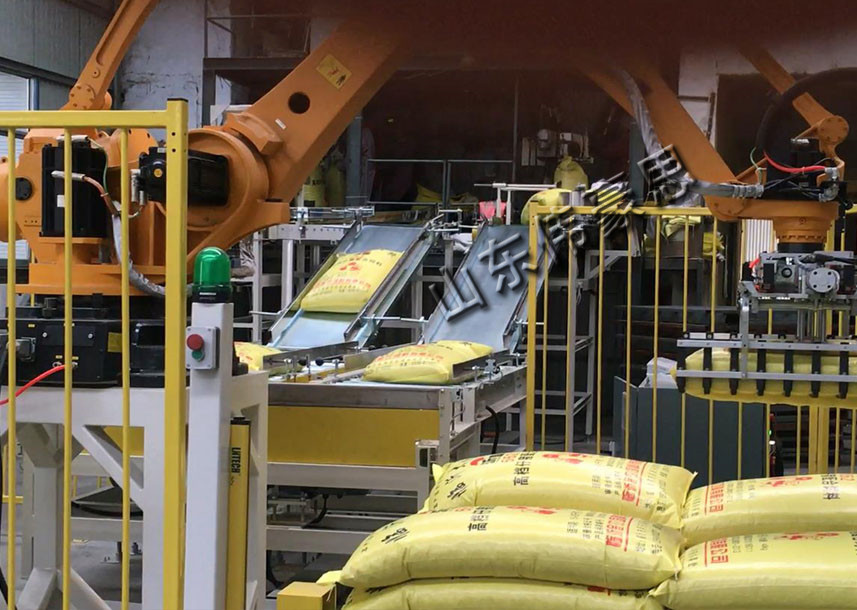 包(bao)裝(zhuang)合格的(de)包(bao)裝(zhuang)袋(dai)(dai)經輸(shu)送機(ji)送到整平機(ji)整平,使袋(dai)(dai)形平整,包(bao)裝(zhuang)袋(dai)(dai)到達抓(zhua)取(qu)輥道,機(ji)械手(shou)檢測到抓(zhua)取(qu)輥道上有包(bao)裝(zhuang)袋(dai)(dai)后,抓(zhua)起包(bao)裝(zhuang)袋(dai)(dai)進行轉向、堆放(fang)(fang),將包(bao)裝(zhuang)袋(dai)(dai)按照(zhao)設置好的(de)垛形進行碼(ma)放(fang)(fang),完成碼(ma)垛工(gong)序。