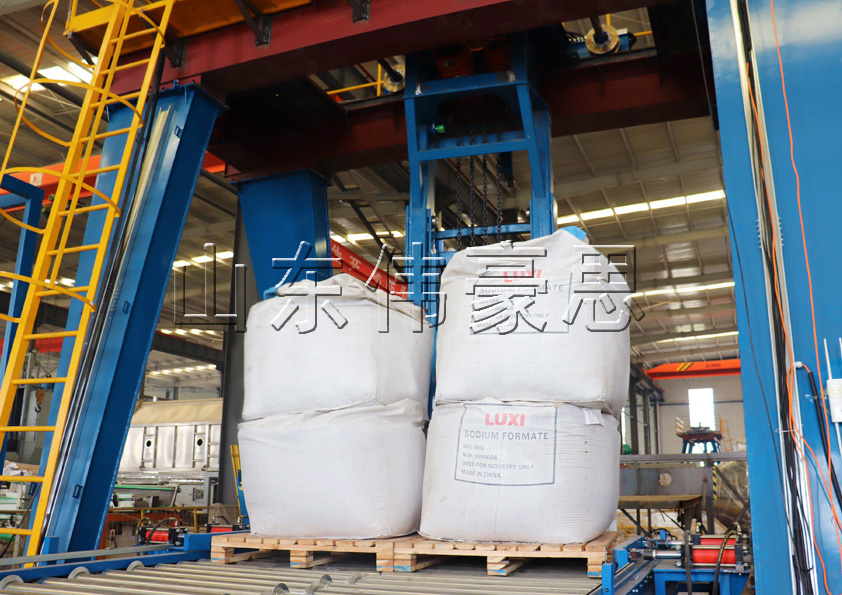 4.物料(liao)輸送至待裝車區,通(tong)過(guo)推出(chu)器,將噸(dun)包推到裝車機叉齒(chi)上