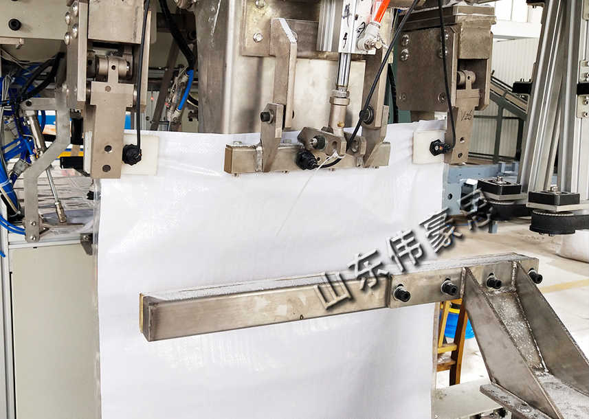 通過氣力輸送系統將物料輸送至暫存料倉中(料倉容積可自訂大小),通過料位感應器感應,當料倉沒料時,所有設備不工作;當有料時,感應器反饋信號給包裝秤,包裝秤開始自動稱重,與此同時,自動上袋機也開始自動上袋,當袋口被套在包裝秤夾袋器上時,包裝秤秤斗開始放料,動作完成后,上袋機抱袋裝置通過皮帶輸送將料袋送至縫包機中,并開始縫包工作,當動作完成后,料袋隨皮帶輸送機送至倒帶整形機中,在料袋送至倒帶整形之前并完成自動噴碼工作,倒帶整型機會先將立著的料袋打倒并旋轉90度,隨后通過整形壓滾將包裝不均勻的物料壓平,并輸送至重量檢測機和金屬檢測機中,當檢測好后,通過剔除機時,不合格的產品將會被剔除,合格的產品將通過提升輸送機送至抓取段輸送機中,與此同時,需人工從托盤庫中將空托盤送至輸送機上,當料袋和托盤準備就位時,機器人開始抓取料袋并碼垛,當碼垛完成時,輸送機將堆碼送至在線纏繞機上,并完成纏繞工作,并繼續下一批包裝堆碼工作。