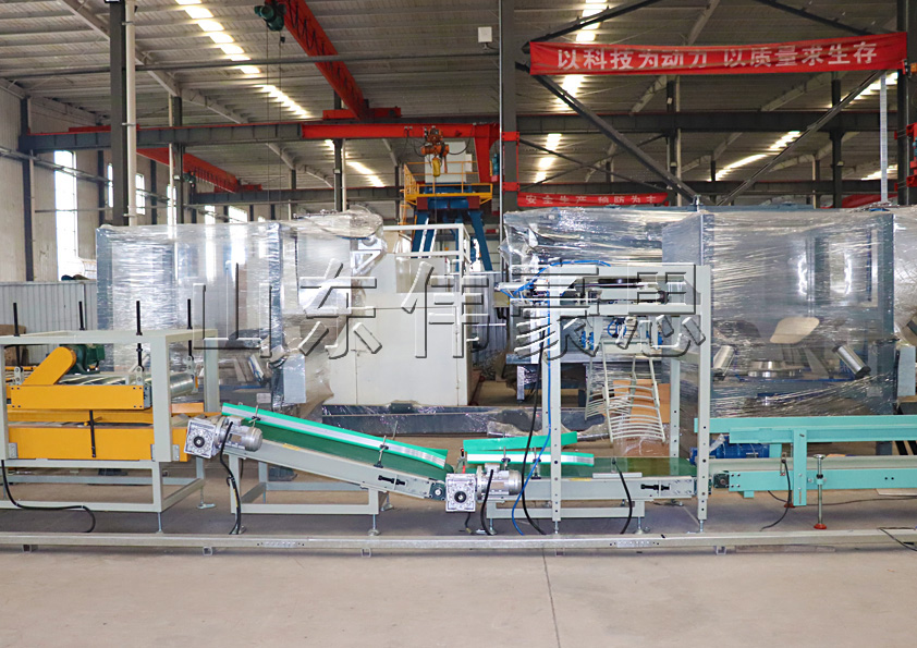 自動供袋——自動(dong)稱(cheng)重包(bao)裝——接包(bao)縫(feng)包(bao)機——輸(shu)送——倒袋整形機 ——金屬檢測機 ——重量復檢機——剔除——垛盤輸(shu)送——機械(xie)手碼垛——纏繞——出垛---AGV小車