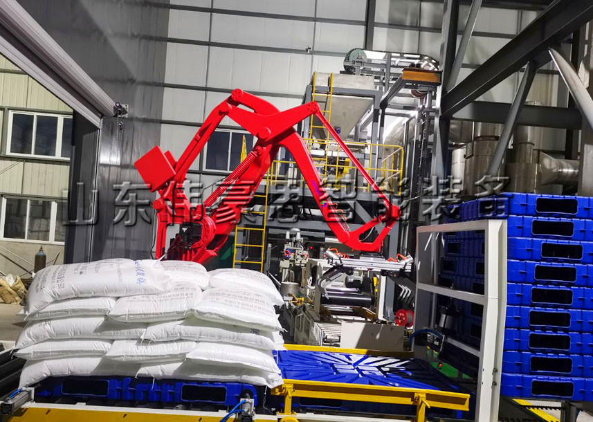 全自動包(bao)裝(zhuang)機與碼(ma)垛系(xi)統組成全自動包裝(zhuang)碼垛(duo)生產線:
