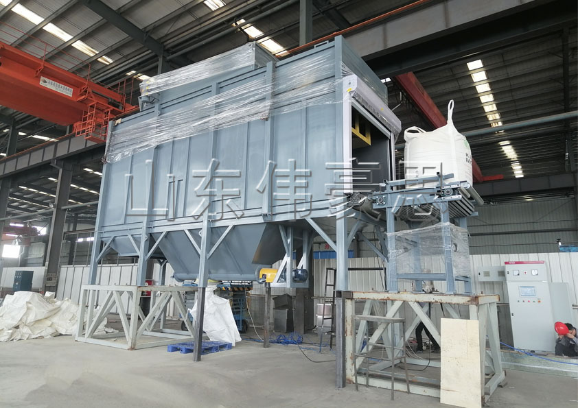 1)拆包(bao)(bao)(bao)(bao)速度快、效率高(gao)。輸(shu)(shu)送(song)機(ji)將(jiang)來(lai)料(liao)噸包(bao)(bao)(bao)(bao)向(xiang)前(qian)輸(shu)(shu)送(song),進入(ru)拆包(bao)(bao)(bao)(bao)機(ji)空(kong)間后停止上(shang)部抓(zhua)(zhua)(zhua)鉤抓(zhua)(zhua)(zhua)取住噸包(bao)(bao)(bao)(bao)頂部,輸(shu)(shu)送(song)機(ji)繼(ji)續前(qian)進,位于噸包(bao)(bao)(bao)(bao)兩側的割(ge)刀依(yi)次(ci)被動(dong)與噸包(bao)(bao)(bao)(bao)接觸,切割(ge)噸包(bao)(bao)(bao)(bao)底圈,將(jiang)噸包(bao)(bao)(bao)(bao)底圈切割(ge)掉四分之三(san),包(bao)(bao)(bao)(bao)內物料(liao)漏出,抓(zhua)(zhua)(zhua)鉤抓(zhua)(zhua)(zhua)包(bao)(bao)(bao)(bao)繼(ji)續前(qian)進,依(yi)次(ci)經拍打,到(dao)達廢(fei)袋口后抓(zhua)(zhua)(zhua)鉤放開,廢(fei)袋自動(dong)落(luo)下。