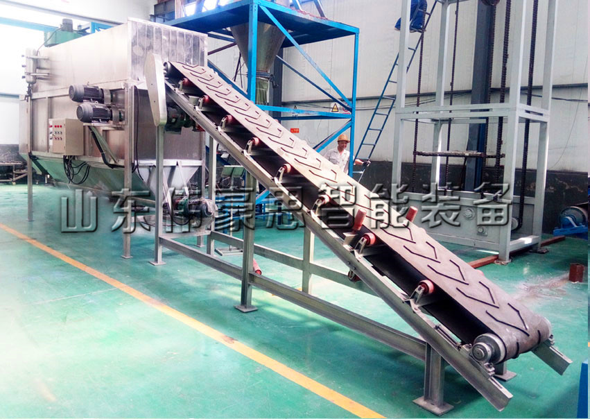 熟石灰自動拆包機工作原理:由機器人自動拆垛或人工將包裝袋放到輸送機上,經過包裝袋整理機的袋子進入破碎機后自動開袋,材料自動分離并經檢測落入下游設備,或進行輸送到預設位置,廢袋自動分離后自動壓縮,自動捆扎,自動打包。開袋過程中產生的揚塵由過濾除塵器凈化過濾達標后排出。