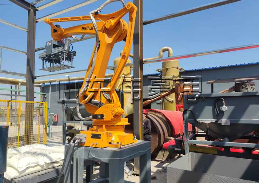 生石灰機械手拆包機在破袋(dai)的過程(cheng)中(zhong)(zhong)和物(wu)料分離(li)過程(cheng)均為全封(feng)閉進(jin)行,而且每個過程(cheng)都有收塵(chen)裝(zhuang)置,無粉塵(chen)外泄,噪(zao)音小,改善了工人的作(zuo)業環境。現(xian)場僅需(xu)自動拆垛(duo)機(ji)器人將包裝(zhuang)袋(dai)放置皮帶輸送機(ji)上即可,減(jian)少了對工作(zuo)的投(tou)入。設備(bei)運行簡單、可靠(kao),故障(zhang)率低,減(jian)少了維護工作(zuo)量。設備(bei)經過特殊設計,殘破袋(dai)裝(zhuang)袋(dai)與(yu)物(wu)料干凈分離(li),不(bu)會摻雜到物(wu)料中(zhong)(zhong),也不(bu)會掛在分離(li)裝(zhuang)置里。