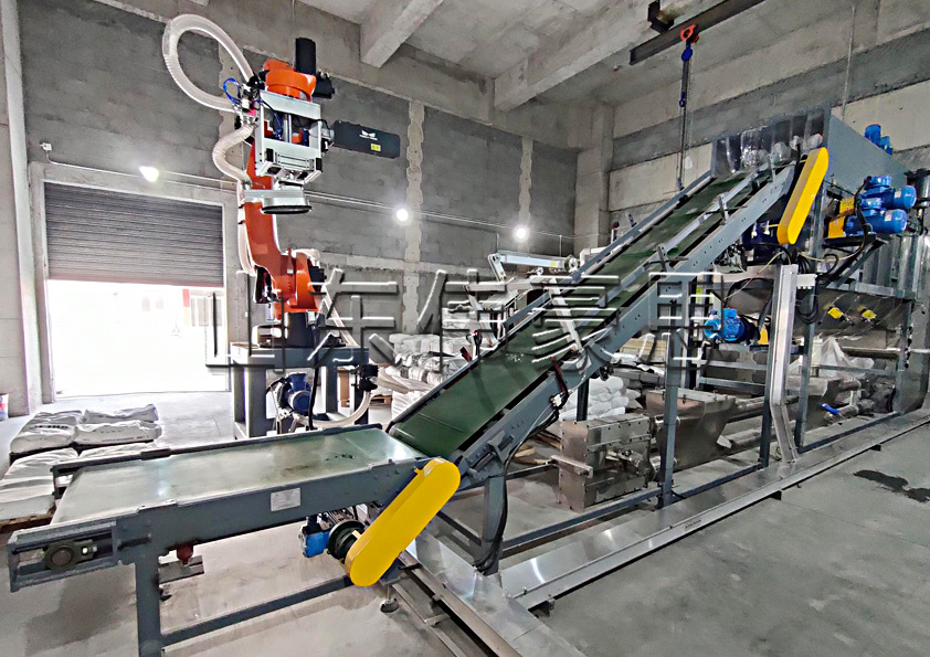 2.通過3D相機(ji)對袋裝物料的位置進行掃描,機(ji)械手準(zhun)確(que)抓取袋裝物料放到皮帶輸(shu)送機(ji)。
