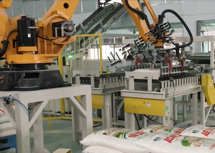 袋(dai)料碼垛(duo)機器(qi)(qi)人(ren)整個(ge)系統(tong)由機器(qi)(qi)人(ren)系統(tong)、碼垛(duo)平(ping)臺等組成(cheng),完(wan)成(cheng)成(cheng)品袋(dai)子(zi)的(de)碼垛(duo)工(gong)(gong)作(zuo)。先由傳送帶把成(cheng)品袋(dai)子(zi)輸送至搬運工(gong)(gong)位,通(tong)過安裝在機器(qi)(qi)人(ren)上的(de)專用抓(zhua)具,快速準確的(de)抓(zhua)取袋(dai)子(zi),按照設定好的(de)程序(xu),把單個(ge)袋(dai)子(zi)碼放(fang)在相應工(gong)(gong)位,再由人(ren)工(gong)(gong)輔助(zhu)下(xia)由叉車搬運至成(cheng)品托(tuo)盤存放(fang)工(gong)(gong)位。