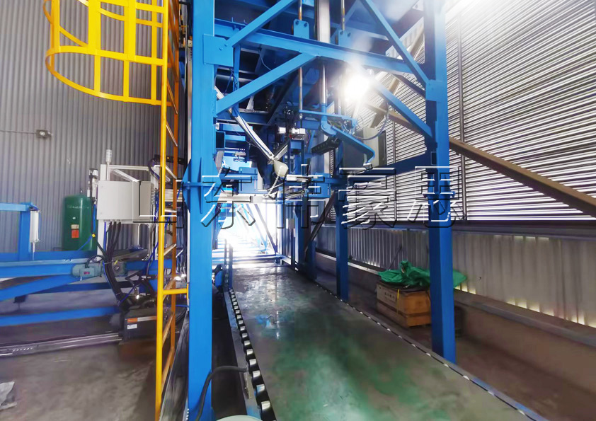 噸袋按照150條袋(dai)(dai)(dai)(dai)(dai)(dai)子(zi)的規格卷(juan)成(cheng)一(yi)卷(juan),叉車將整(zheng)捆包(bao)(bao)(bao)裝(zhuang)(zhuang)(zhuang)袋(dai)(dai)(dai)(dai)(dai)(dai)放入(ru)袋(dai)(dai)(dai)(dai)(dai)(dai)框,空包(bao)(bao)(bao)裝(zhuang)(zhuang)(zhuang)袋(dai)(dai)(dai)(dai)(dai)(dai)在(zai)(zai)輸送機(ji)(ji)上(shang)前移,當包(bao)(bao)(bao)裝(zhuang)(zhuang)(zhuang)袋(dai)(dai)(dai)(dai)(dai)(dai)袋(dai)(dai)(dai)(dai)(dai)(dai)口(kou)(kou)(kou)到達合適位(wei)置時(shi),傳感器將包(bao)(bao)(bao)裝(zhuang)(zhuang)(zhuang)袋(dai)(dai)(dai)(dai)(dai)(dai)到位(wei)信號傳送到總(zong)控PLc,plc發出指令(ling),上(shang)下吸盤將包(bao)(bao)(bao)裝(zhuang)(zhuang)(zhuang)袋(dai)(dai)(dai)(dai)(dai)(dai)袋(dai)(dai)(dai)(dai)(dai)(dai)口(kou)(kou)(kou)吸住并(bing)拉開,機(ji)(ji)械手(shou)將包(bao)(bao)(bao)裝(zhuang)(zhuang)(zhuang)袋(dai)(dai)(dai)(dai)(dai)(dai)袋(dai)(dai)(dai)(dai)(dai)(dai)口(kou)(kou)(kou)夾住,并(bing)將包(bao)(bao)(bao)裝(zhuang)(zhuang)(zhuang)袋(dai)(dai)(dai)(dai)(dai)(dai)前移、提(ti)(ti)升,將包(bao)(bao)(bao)裝(zhuang)(zhuang)(zhuang)袋(dai)(dai)(dai)(dai)(dai)(dai)套(tao)入(ru)下料(liao)口(kou)(kou)(kou);同(tong)時(shi)稱重系(xi)統在(zai)(zai)接(jie)受(shou)到包(bao)(bao)(bao)裝(zhuang)(zhuang)(zhuang)袋(dai)(dai)(dai)(dai)(dai)(dai)套(tao)袋(dai)(dai)(dai)(dai)(dai)(dai)成(cheng)功信號后,將物料(liao)按照設定重力投入(ru)噸包(bao)(bao)(bao)裝(zhuang)(zhuang)(zhuang)袋(dai)(dai)(dai)(dai)(dai)(dai)中,完成(cheng)物料(liao)的灌裝(zhuang)(zhuang)(zhuang)。灌裝(zhuang)(zhuang)(zhuang)完成(cheng)后,撐(cheng)袋(dai)(dai)(dai)(dai)(dai)(dai)機(ji)(ji)構將包(bao)(bao)(bao)裝(zhuang)(zhuang)(zhuang)袋(dai)(dai)(dai)(dai)(dai)(dai)袋(dai)(dai)(dai)(dai)(dai)(dai)口(kou)(kou)(kou)拉伸,超(chao)聲波封(feng)口(kou)(kou)(kou)機(ji)(ji)將袋(dai)(dai)(dai)(dai)(dai)(dai)口(kou)(kou)(kou)縫合,輔助機(ji)(ji)構將袋(dai)(dai)(dai)(dai)(dai)(dai)口(kou)(kou)(kou)整(zheng)理,調(diao)姿機(ji)(ji)構將包(bao)(bao)(bao)裝(zhuang)(zhuang)(zhuang)袋(dai)(dai)(dai)(dai)(dai)(dai)系(xi)帶提(ti)(ti)起(qi)并(bing)調(diao)整(zheng)系(xi)帶方向,利于后續碼(ma)垛系(xi)統自動碼(ma)垛。至此,系(xi)統完成(cheng)一(yi)次(ci)噸袋(dai)(dai)(dai)(dai)(dai)(dai)的全自動灌裝(zhuang)(zhuang)(zhuang)過程。
