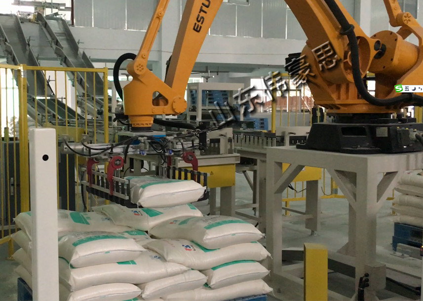 5、抓袋碼垛(duo)機構。采用機器人(ren)碼垛(duo)機構完成(cheng)碼垛(duo)作業(ye)。