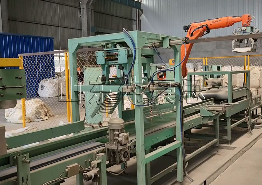 在滑石粉自動碼垛機器人的前端添加全自動包裝機組成自動包裝碼垛流水線,它能為客戶提供從自動稱重、自動填充、自動上袋、自動封口,金屬檢測、重量檢測到自動碼垛的全套解決方案,以實現物料從成品出倉供料、上袋、稱重、裝袋、封口、輸送整形、重量檢測、金屬檢測、檢選篩選、噴碼打印、自動碼垛全過程的自動化操作程序.