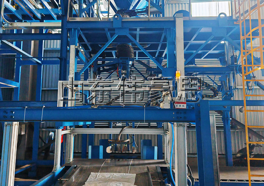 1.準備階段:噸袋(dai)按照150條(tiao)袋(dai)子的規格卷成一卷,叉車將整捆包裝袋(dai)放入袋(dai)框,空包裝袋(dai)在(zai)輸送機上前移。