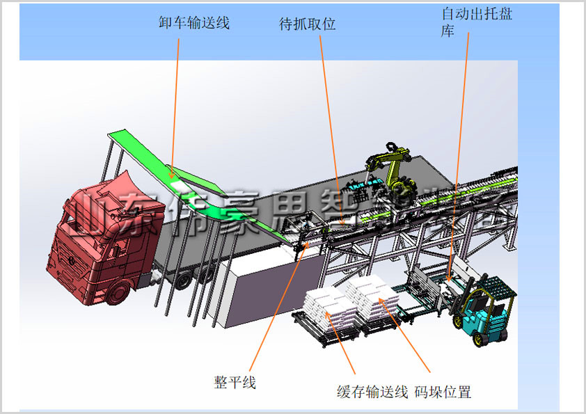 自(zi)動卸車(che)機+碼垛機器(qi)人(ren)工作流程:
