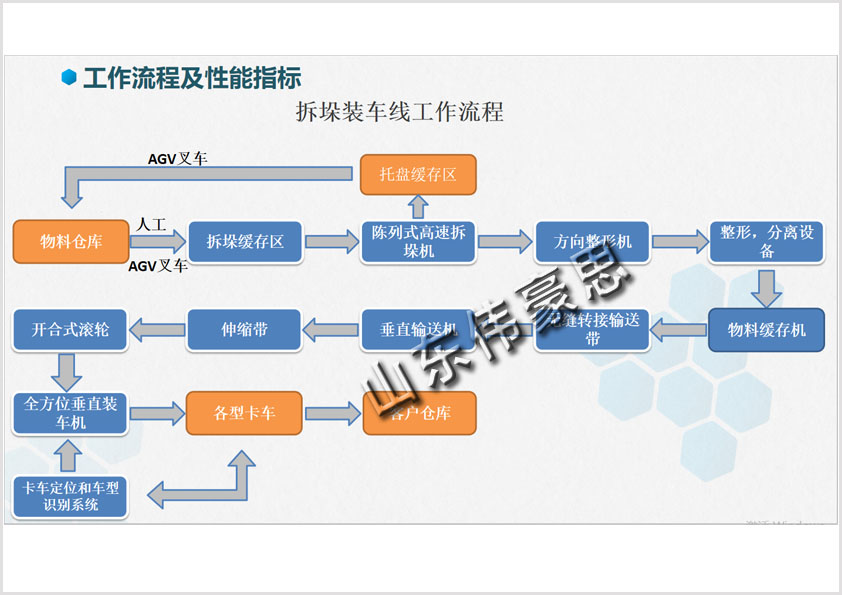 智能(neng)高速拆(chai)(chai)垛(duo)裝(zhuang)車(che)(che)(che)線(xian)用(yong)于多種(zhong)平板車(che)(che)(che)、高欄(lan)車(che)(che)(che)等貨運汽車(che)(che)(che)的貨物(wu)(wu)裝(zhuang)車(che)(che)(che)。能(neng)完成袋類(lei)包裝(zhuang)物(wu)(wu)自(zi)(zi)(zi)動(dong)拆(chai)(chai)垛(duo),袋形矯(jiao)正,自(zi)(zi)(zi)動(dong)緩存,對車(che)(che)(che)輛進(jin)行智能(neng)定位(wei),自(zi)(zi)(zi)動(dong)裝(zhuang)車(che)(che)(che)等功能(neng)。可實現貨物(wu)(wu)從智能(neng)倉庫到物(wu)(wu)流的自(zi)(zi)(zi)動(dong)化(hua)無(wu)縫鏈(lian)接作業(ye)。可根據客(ke)戶需(xu)求及不同場地,物(wu)(wu)料等特(te)(te)性提供特(te)(te)定的完整(zheng)解決(jue)方(fang)案。生(sheng)產線(xian)裝(zhuang)車(che)(che)(che)能(neng)力可達每小時1200包。