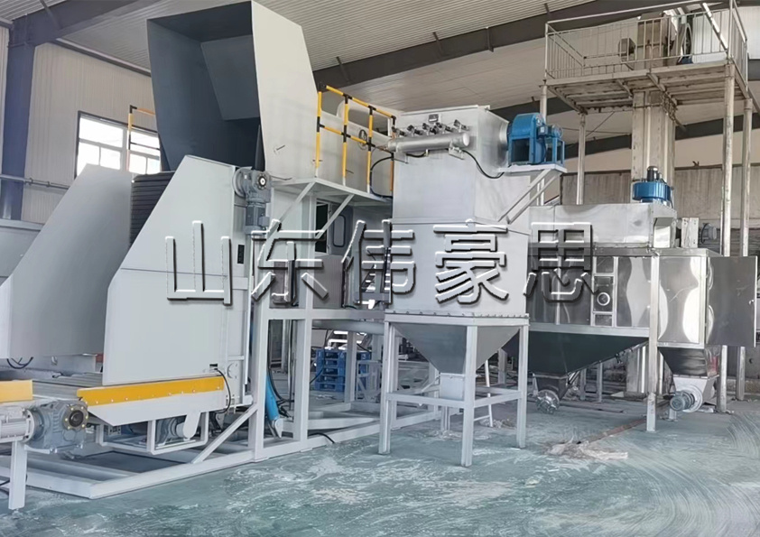 袋(dai)裝(zhuang)粉體(ti)物(wu)料(liao)(liao)整垛(duo)(duo)(duo)用叉車運到(dao)鏈(lian)板輸(shu)(shu)送(song)機(ji)上,鏈(lian)板輸(shu)(shu)送(song)機(ji)把(ba)垛(duo)(duo)(duo)料(liao)(liao)輸(shu)(shu)送(song)到(dao)垛(duo)(duo)(duo)料(liao)(liao)翻(fan)轉(zhuan)機(ji)構上,垛(duo)(duo)(duo)料(liao)(liao)翻(fan)轉(zhuan)機(ji)構把(ba)垛(duo)(duo)(duo)料(liao)(liao)進行翻(fan)轉(zhuan)梳理后輸(shu)(shu)送(song)到(dao)割(ge)(ge)刀上部的(de)滑(hua)(hua)板部分,料(liao)(liao)袋(dai)依靠重力沿滑(hua)(hua)板下滑(hua)(hua),在下滑(hua)(hua)過(guo)程中由(you)快速轉(zhuan)動的(de)刀片將包裝(zhuang)袋(dai)割(ge)(ge)開,被割(ge)(ge)開的(de)殘袋(dai)和物(wu)料(liao)(liao)滑(hua)(hua)入滾(gun)筒(tong)(tong)篩(shai)(shai)進行篩(shai)(shai)分。從滾(gun)筒(tong)(tong)篩(shai)(shai)落(luo)下的(de)物(wu)料(liao)(liao)由(you)螺(luo)旋輸(shu)(shu)送(song)機(ji)輸(shu)(shu)出,破(po)損的(de)包裝(zhuang)袋(dai)被滾(gun)筒(tong)(tong)篩(shai)(shai)帶出機(ji)體(ti)。割(ge)(ge)刀破(po)袋(dai)過(guo)程中引起(qi)的(de)粉塵由(you)布(bu)袋(dai)式除塵器捕捉并抖(dou)落(luo)入螺(luo)旋輸(shu)(shu)送(song)機(ji),拆袋(dai)完成(cheng)后的(de)垛(duo)(duo)(duo)盤由(you)垛(duo)(duo)(duo)盤收集器進行收集碼垛(duo)(duo)(duo)。